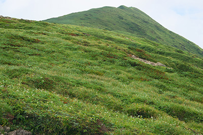 翌日2時に起床して月山八合目に到着したのが5時。今日は天気に恵まれたようだ。朝焼けの鳥海山がすばらしい。 駐車場からすぐに木道が整備された周遊コースの弥陀ヶ原を行く。 弥陀ヶ原を抜けると登山道は勾配がきつくなり霧が出て来た。 登山道脇には高山植物が咲いてとても綺麗だ。 霧に日差しが遮られ下界の危険な暑さがうそのようだ。立ち止まっていると肌寒くなるほどだ。