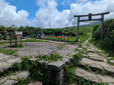 仏生池小屋の背後に見えるのがオモワシ山。真の頂を隠して、自らを頂上と「思わし」めることに由来してしるとか。 この先で急斜面の中ほどに、行者返しの木碑が建っている。 役行者が山頂を目指した時に、蜂子皇子に使える除魔童子に修行の未熟を悟らされ、羽黒山に返されたとの伝説がある場所だ。 さらに山頂をめざす。だんだんと霧が晴れて景色がみえるようになると急に暑さが気になる。